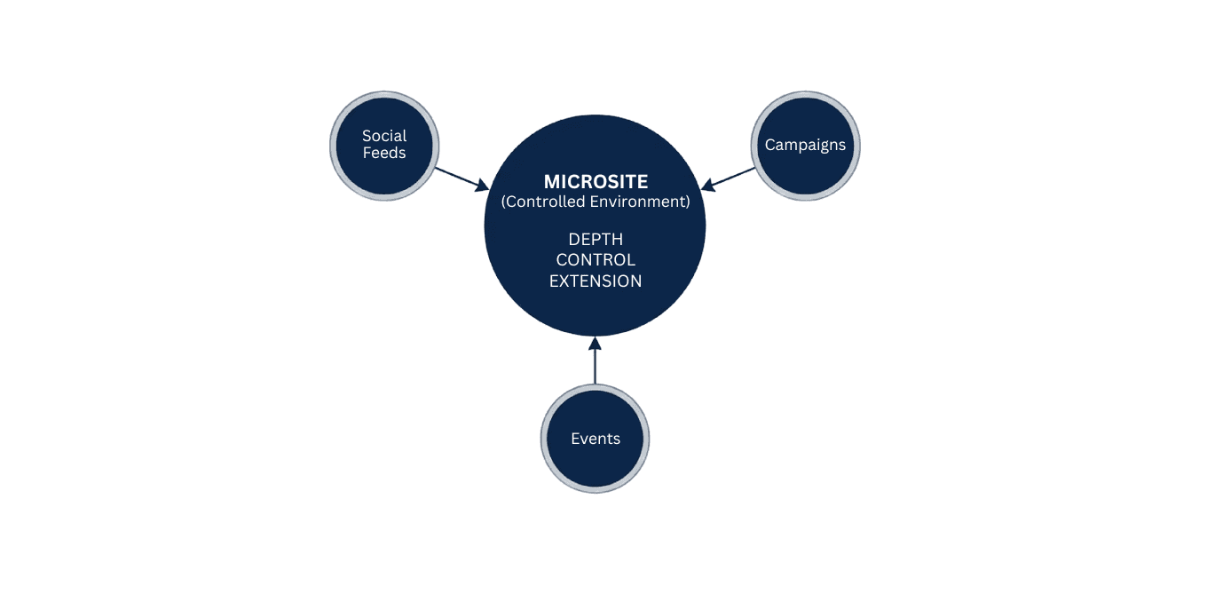 Microsites act as integral nodes for high-intent audiences, free from algorithm interference and allowing for deep-dive storytelling.